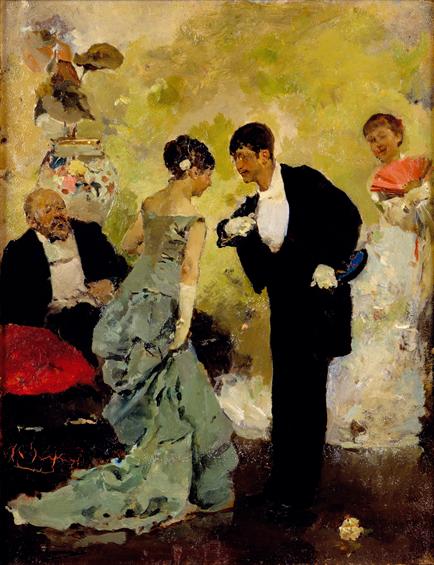 O casal prepara-se para dançar. No verso do quadro está escrito “L’invitation à la valse”. À esquerda, sentado, está o homem mais velho junto a uma almofada vermelha, alheado da cena. À direita, de pé, a jovem observa o casal, segurando um leque rosado que dialoga com a cor da almofada. A pincelada solta caracteriza toda a pintura de pequenas dimensões 26 x 21,5 cm.