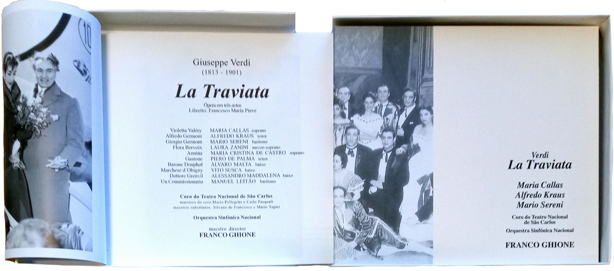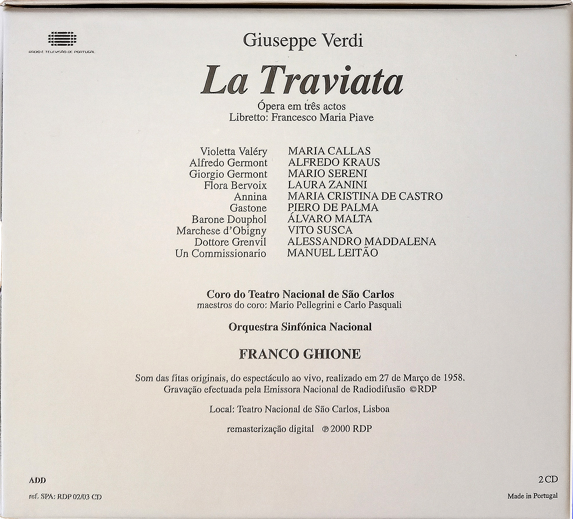 A propósito desta sua viagem a terras lusas, e da inesquecível interpretação de La Traviata no Teatro de São Carlos, recordamos a edição pela RTP /Antena 2, da caixa de duplo CD, com a gravação pela Emissora Nacional desta récita em Lisboa, em Março de 1958, em que Maria Callas era a protagonista principal, coadjuvada pelos cantores Alfredo Kraus e Mario Sereni, com o Coro do Teatro Nacional de São Carlos e a Orquestra Sinfónica Portuguesa (pertencente à Emissora Nacional), dirigida por Franco Ghione.